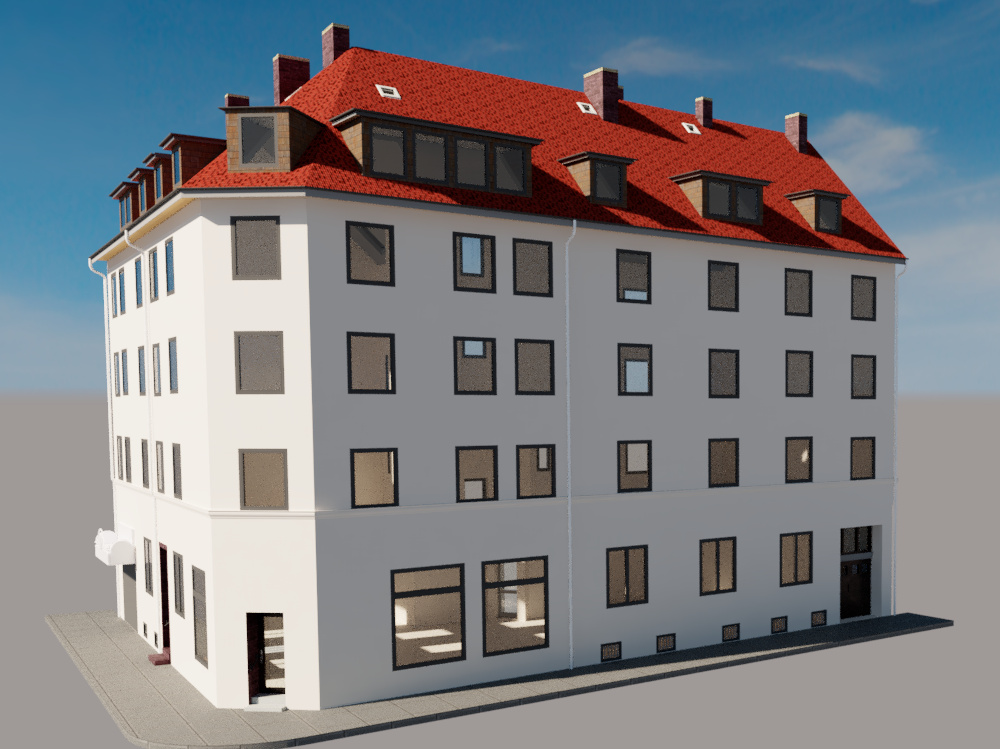 Für ein Bestandsgebäude in Hannover wurde eine vollständige digitale Bestandsvermessung mittels 3D-Laserscanning und ergänzender Drohnenaufnahmen durchgeführt.