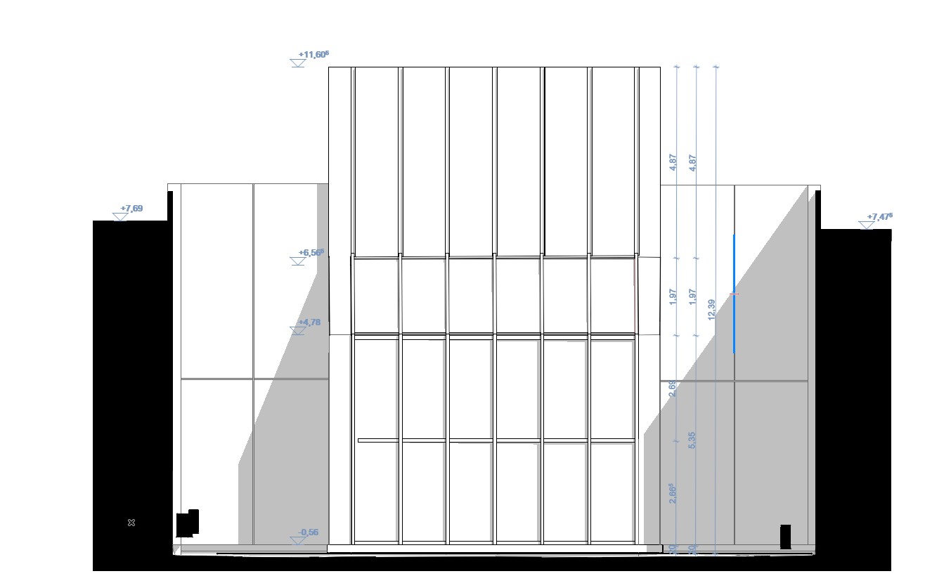 Zusätzlich mussten die baulich komplexen Glasfassaden in Pfosten-/Riegelkonstruktion an der Nord- und Südfassade maß genau dokumentiert werden, da ein energetischer Austausch der Verglasung vorgesehen ist.