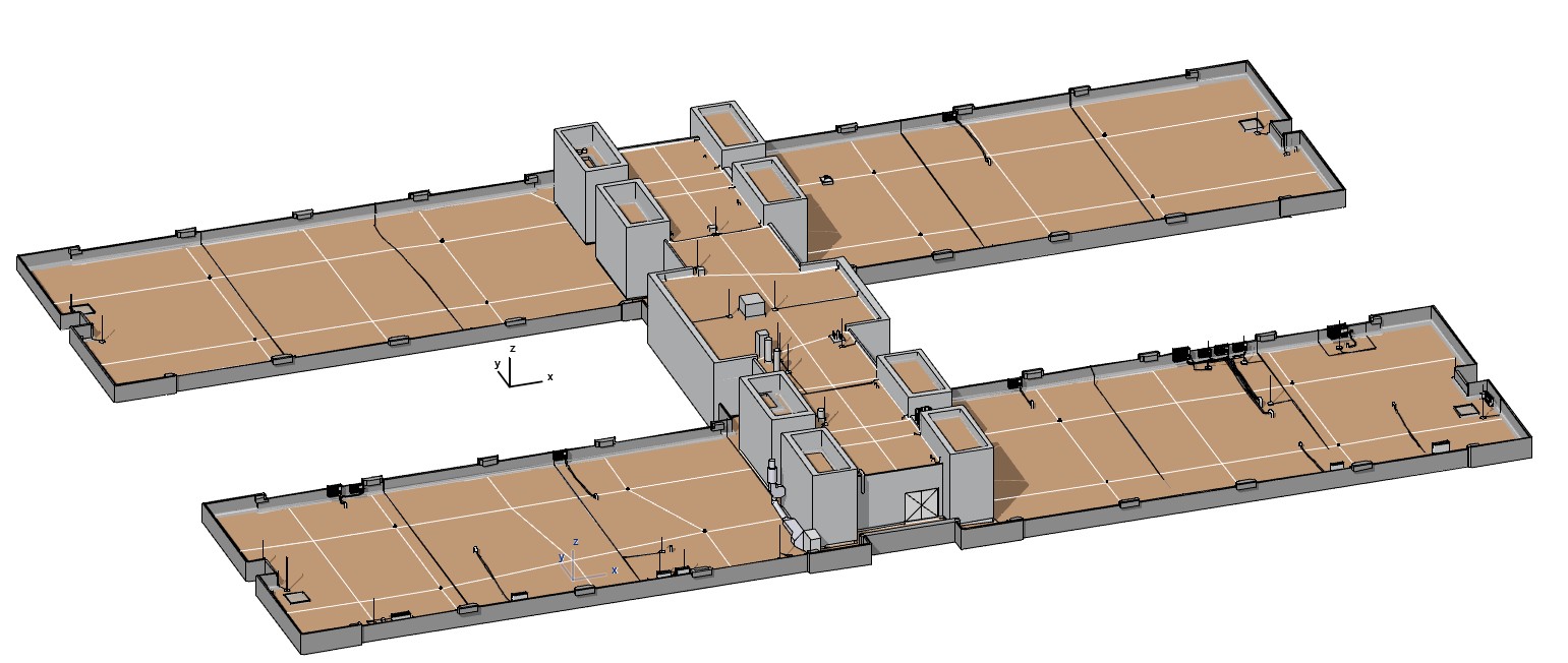 Das Gebäude verfügt über ein Flachdach mit H-förmigem Grundriss sowie mehrere aufgesetzte Versorgungstürme für Lüftung, Zuluftführung, Lichtschächte und technische Anlagen.