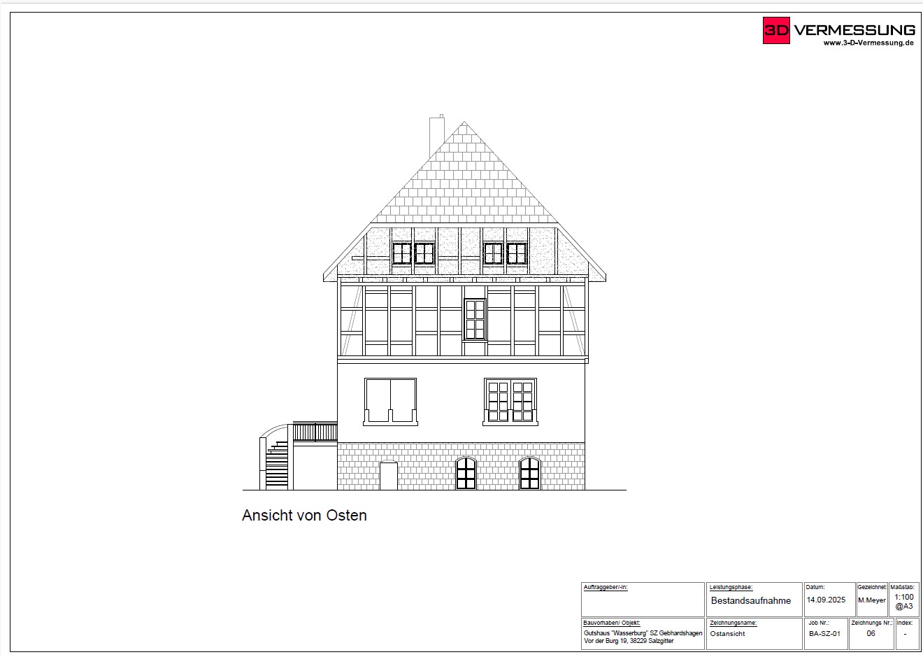 Aus der erzeugten Punktwolke der Wasserburg Salzgitter-Gebhardshagen wurden präzise Grundrisse, Gebäudeschnitte und Fassadenansichten abgeleitet. Diese Daten dienen als Grundlage für Planung, Sanierung und denkmalgerechte Dokumentation.